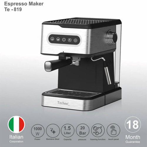 اسپرسو ساز تکنو مدل Te-819 با ظاهری زیبا و منحصر به فرد طراحی شده و با توجه به کیفیت ساختی که دارد، برای مصارف خانگی و یا کافه های کوچک انتخاب بسیار مناسبی می باشد. اسپرسو ساز تکنو مدل Te-819 با توان 1000 وات و فشار پمپ بخار 20 بار قادر است، در مدت زمان کوتاهی انواع نوشیدنی هایی همچون اسپرسو، کاپوچینو و لاته را با حفظ طعم واقعی تهیه نماید. همچنین نازلی در کنار اسپرسو ساز تکنو مدل Te-819 جهت تهیه کف شیر برای کاپوچینو تعبیه شده و سینی آن به صورت متحرک و چکه گیر می باشد که مانع از چکیدن مایعات از دستگاه می گردد .